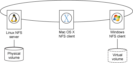 The above diagram shows the Linux NFS Server exporting its physical hard disks to the NFS Clients. The mounting an NFS file system is transparent to the client as when mounted, applications simply read and write files, subject to access control, oblivious to the machinations required to persist data. A pretty neat solution