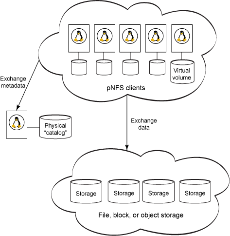 Thus, pNFS retains all the niceties and conveniences of NFS and improves performance and scalability. The number of clients can be expanded to provide more computing power, while the size of the storage system can expand with little impact on client configuration. All you need to do is keep the pNFS catalog and storage system in sync.