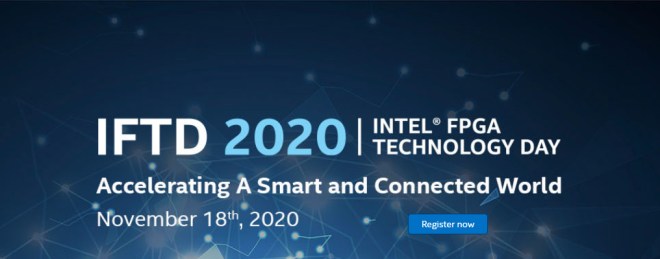 Intel® FPGA Technology Day (IFTD) is a one-day virtual event that showcases the latest Intel FPGA products and solutions through a series of webinars and demonstrations from Intel, partners, and customers. During this day-long event, you will learn how Intel® FPGAs, Intel® eASIC structured ASICs, Intel® SmartNICs, and Intel® Enpirion® power solutions can shorten your design cycle, help to overcome your many design challenges, and accelerate business innovation. In the IFTD 2020 virtual exhibition space, you will see Intel® FPGA technology in action in the edge, in data centers, and in the cloud. IFTD 2020 takes place on November 18, 2020.