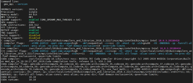 December 29, 2020 by kittycool only Testing compatibility of Gromacs with CUDA Drivers To test whether you have compiled your GROMACS correctly with the CUDA drivers and runtime. You can use the command % gmx_mpi --version You should see GPU support: CUDA ..... ..... CUDA driver: 10.10 CUDA runtime: 10.10 Share this: Click to share on Facebook (Opens in new window) Facebook Click to share on X (Opens in new window) X Like Loading... Related