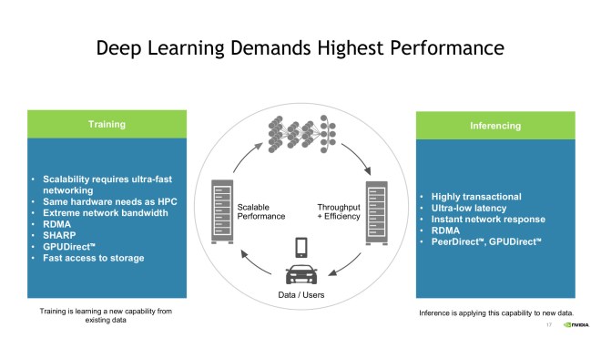 There is this question that I wanted to find out about deep learning. What are essential System, Network, Protocol that will speed up the Training and/or Inferencing. There may not be necessary to employ the same level of requirements from Training to Inferencing and Vice Versa. I have received this information during a Nvidia Presentation