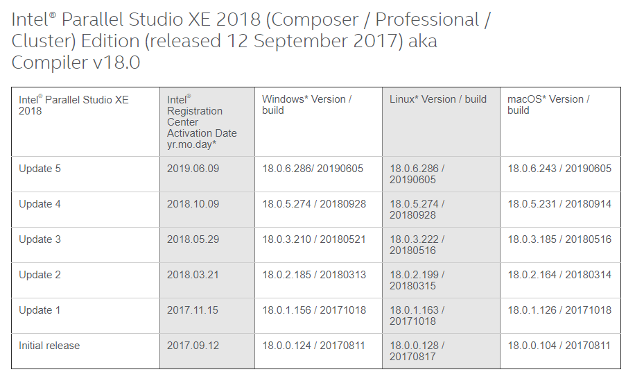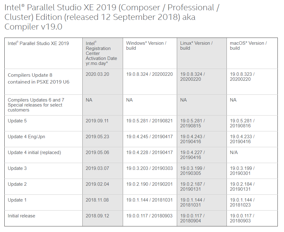 May 25, 2021 by kittycool only Intel Compilers Edition Update Version Mapping This Website is important to get the right mapping for the Version Running Mapping from Intel. This is Good Information “Intel® Compiler version numbers to Intel® Parallel Studio XE (Composer / Professional / Cluster) Edition update version numbers mapping“ Just took a snapshot of Intel 2018 to 2020