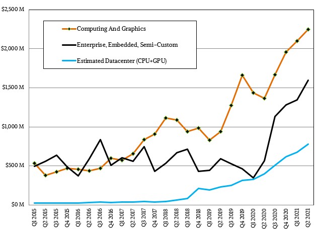 We do get some hints, however. Lisa Su, AMD’s president and chief executive officer, said that AMD’s datacenter business – at this point meaning Epyc CPUs and Instinct GPU accelerators – comprised more than 20 percent of the company’s overall sales, and the big driver in this quarter was not just second generation “Rome” Epyc 7002 and third generation “Milan” Epyc 7003 server chips – Rome is still outselling Milan, but the crossover is coming in the third quarter of this year – but the Radeon Instinct M100 GPU accelerators launched last fall. The datacenter GPU business more than doubled from a year ago, according to Su, and AMD expects it to continue to grow in the second half of the year as the 1.5 exaflops “Frontier” supercomputer at Oak Ridge National Laboratory in the United States, the as-yet-unnamed pre-exascale system at Pawsey Supercomputing Center in Australia, and the Lumi pre-exascale system in Finland all get their Radeon Instinct motors installed.
