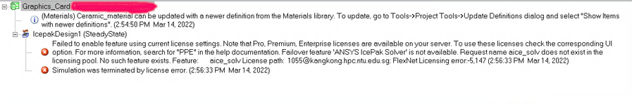 "If you have this error "Failed to enable features using current license settings. Note that Pro, Premium, Enterprise licenses are available on your server. To use these licenses check the corresponding option. For more information, search "PPE" in the help documentation. Failover feature "ANSYS IcePak Solver" is not available. Request name aice_solv does not exist in the....."