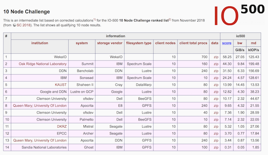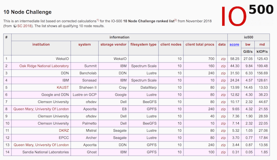 The IO-500 10 Node Challenge is a ranked list comparing storage systems that work in tandem with the world’s largest supercomputers. By limiting the benchmark to 10 nodes, the test challenges single client performance from the storage system. Each system is evaluated using the IO-500 benchmark that measures the storage performance using read/write bandwidth for large files and read/write/listing performance for small files…. from InsideHPC